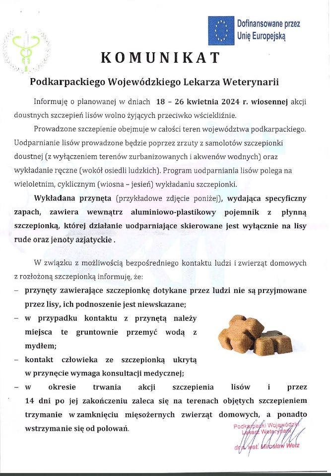 Zgodnie z informacją Wojewódzkiego Lekarza Weterynarii w terminie 18 - 26 kwietnia 2024 r. planowana jest wiosenna akcja szczepienia lisów wolno żyjących przeciwko wściekliźnie. Szczegóły w załączonym komunikacie.