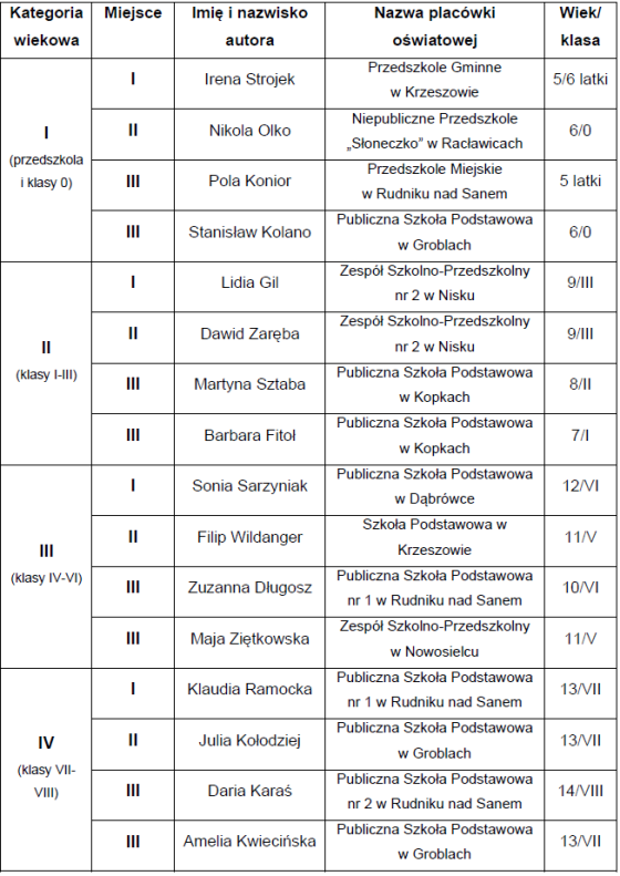 Komisja oceniająca stanęła zatem przed bardzo trudnym wyborem zwycięzców. W każdej z kategorii przyznano I i II miejsce oraz z uwagi na tak liczną ilość prac konkursowych po dwa miejsca III ex aequo . Wyniki przedstawia tabela.Prace laureatów możecie Państwo obejrzeć w załączonej galerii.